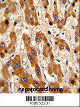 Formalin-fixed and paraffin-embedded human hepatocarcinoma reacted with Bax Antibody (BH3 Domain Specific), which was peroxidase-conjugated to the secondary antibody, followed by DAB staining. This data demonstrates the use of this antibody for immunohistochemistry; clinical relevance has not been evaluated. |