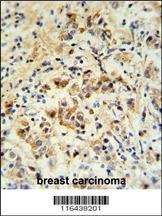 mouse BID Antibody (S61)(Cat. APR08489G) IHC analysis in formalin fixed and paraffin embedded human breast carcinoma followed by peroxidase conjugation of the secondary antibody and DAB staining. This data demonstrates the use of the mouse BID Antibody (S61) for immunohistochemistry. Clinical relevance has not been evaluated.