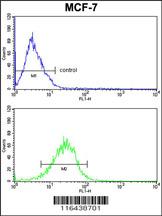 mouse BID Antibody (S61) (Cat. APR08489G) FC analysis of MCF-7 cells (bottom histogram) compared to a negative control cell (top histogram). FITC-conjugated goat-anti-rabbit secondary antibodies were used for the analysis. |