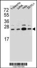 SSR2 Antibody (C-term) (Cat. AMM07989G) western blot analysis in human placenta tissue and Jurkat,Hela,ZR-75-1 cell line lysates (35ug/lane).This demonstrates the SSR2 antibody detected the SSR2 protein (arrow).