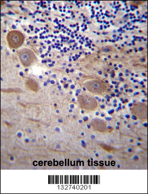 SSR2 Antibody (C-term) (Cat. AMM07989G)immunohistochemistry analysis in formalin fixed and paraffin embedded human cerebellum tissue followed by peroxidase conjugation of the secondary antibody and DAB staining.This data demonstrates the use of SSR2 Antibody (C-term) for immunohistochemistry. Clinical relevance has not been evaluated.