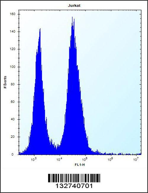 SSR2 Antibody (C-term) (Cat. AMM07989G) flow cytometric analysis of Jurkat cells (right histogram) compared to a negative control cell (left histogram).FITC-conjugated donkey-anti-rabbit secondary antibodies were used for the analysis. |