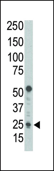 Western blot analysis of anti-Puma BH3 domain Pab (Cat. APR07168G) in HL-60 cell lysate. Puma BH3 domain (arrow) was detected using purified Pab. Secondary HRP-anti-rabbit was used for signal visualization with chemiluminescence.