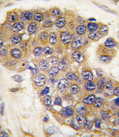 Formalin-fixed and paraffin-embedded human breast carcinoma tissue reacted with Puma BH3 Domain antibody (Cat. APR07168G), which was peroxidase-conjugated to the secondary antibody, followed by DAB staining. This data demonstrates the use of this antibody for immunohistochemistry; clinical relevance has not been evaluated.