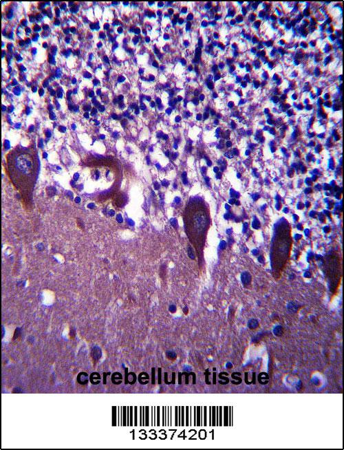 TLE6 Antibody (N-term) (Cat. AMM08219G)immunohistochemistry analysis in formalin fixed and paraffin embedded human cerebellum tissue followed by peroxidase conjugation of the secondary antibody and DAB staining.This data demonstrates the use of TLE6 Antibody (N-term) for immunohistochemistry. Clinical relevance has not been evaluated. |