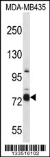 CASS4 Antibody (C-term) (Cat. APR15273G) western blot analysis in MDA-MB435 cell line lysates (35ug/lane).This demonstrates the CASS4 antibody detected the CASS4 protein (arrow). |