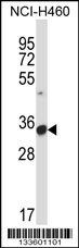 FCGR3A Antibody (C-term) (Cat. APR15941G) western blot analysis in NCI-H460 cell line lysates (35ug/lane).This demonstrates the FCGR3A antibody detected the FCGR3A protein (arrow). |
