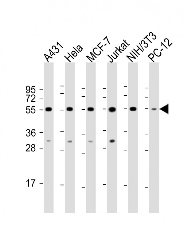 All lanes : Anti-TUBA4A Antibody (C-term) at 1:2000 dilution Lane 1: A431 whole cell lysate Lane 2: Hela whole cell lysate Lane 3: MCF-7 whole cell lysate Lane 4: Jurkat whole cell lysate Lane 6: NIH/3T3 whole cell lysate Lane 5: PC-12 whole cell lysate Lysates/proteins at 20 μg per lane. Secondary Goat Anti-Rabbit IgG, (H+L), Peroxidase conjugated at 1/10000 dilution. Predicted band size : 50 kDa Blocking/Dilution buffer: 5% NFDM/TBST.