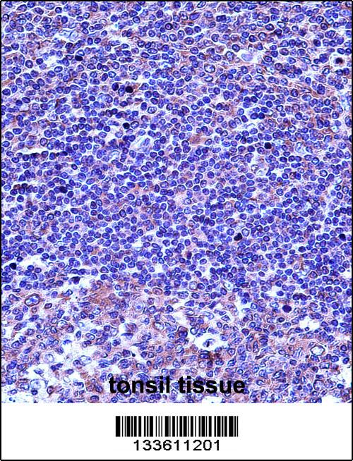 TUBA4A Antibody (C-term) (Cat. APR13862G)immunohistochemistry analysis in formalin fixed and paraffin embedded human tonsil tissue followed by peroxidase conjugation of the secondary antibody and DAB staining.This data demonstrates the use of TUBA4A Antibody (C-term) for immunohistochemistry. Clinical relevance has not been evaluated. |