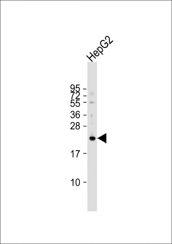 Anti-VKORC1L1 Antibody (N-term) at 1:2000 dilution + human HepG2 lysate Lysates/proteins at 20 μg per lane. Secondary Goat Anti-Rabbit IgG, (H+L), Peroxidase conjugated at 1/10000 dilution. Predicted band size : 20 kDa Blocking/Dilution buffer: 5% NFDM/TBST.