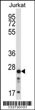 ARHGDIB Antibody (C-term) (Cat. APR14308G) western blot analysis in Jurkat cell line lysates (35ug/lane).This demonstrates the ARHGDIB antibody detected the ARHGDIB protein (arrow).