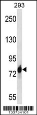 CDH16 Antibody (C-term) (Cat. APR15392G) western blot analysis in 293 cell line lysates (35ug/lane).This demonstrates the CDH16 antibody detected the CDH16 protein (arrow). |