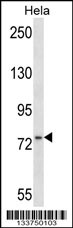 MSN Antibody (C-term) (Cat. APR17463G) western blot analysis in Hela cell line lysates (35ug/lane).This demonstrates the MSN antibody detected the MSN protein (arrow). |