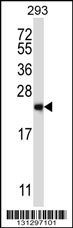 RAB1B Antibody (C-term) (Cat. AMM07437G) western blot analysis in 293 cell line lysates (35ug/lane).This demonstrates the RAB1B antibody detected the RAB1B protein (arrow). |