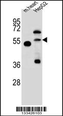 NOSTRIN Antibody (Center) (Cat. AMM06754G) western blot analysis in mouse heart tissue and HepG2 cell line lysates (35ug/lane).This demonstrates the NOSTRIN antibody detected the NOSTRIN protein (arrow). |
