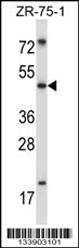 MDM4 Antibody (Center) (Cat. APR08404G) western blot analysis in ZR-75-1 cell line lysates (35ug/lane).This demonstrates the MDM4 antibody detected the MDM4 protein (arrow). |