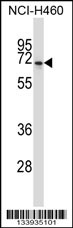 NPFFR2 Antibody (N-term) (Cat. AMM06792G) western blot analysis in NCI-H460 cell line lysates (35ug/lane).This demonstrates the NPFFR2 antibody detected the NPFFR2 protein (arrow). |