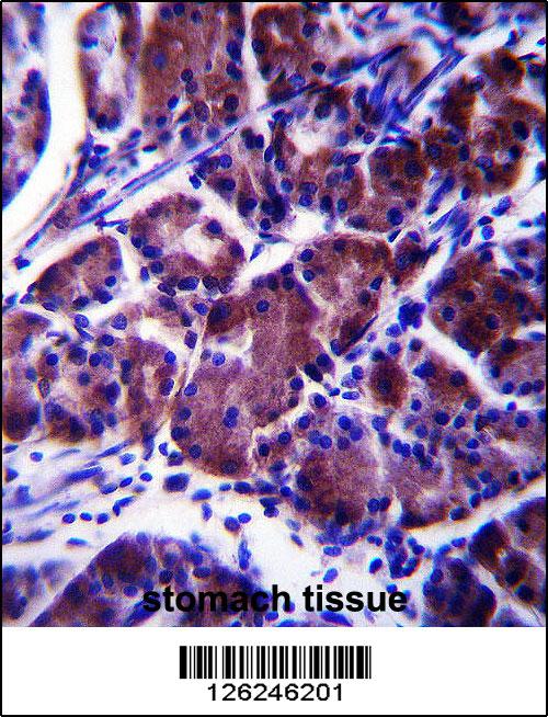 LYPL1 Antibody (Center) (Cat. APR17264G)immunohistochemistry analysis in formalin fixed and paraffin embedded human stomach tissue followed by peroxidase conjugation of the secondary antibody and DAB staining.This data demonstrates the use of LYPL1 Antibody (Center) for immunohistochemistry. Clinical relevance has not been evaluated.