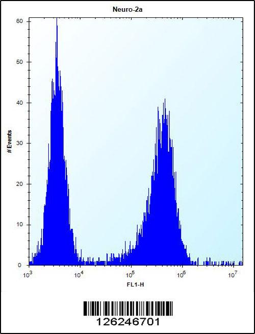 LYPL1 Antibody (Center) (Cat. APR17264G) flow cytometric analysis of Neuro-2a cells (right histogram) compared to a negative control cell (left histogram).FITC-conjugated donkey-anti-rabbit secondary antibodies were used for the analysis. |