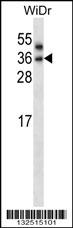 PNPLA4 Antibody (C-term) (Cat. AMR09413G) western blot analysis in WiDr cell line lysates (35ug/lane).This demonstrates the PNPLA4 antibody detected the PNPLA4 protein (arrow).