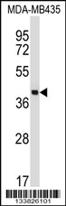 SFTPD Antibody (C-term) (Cat. AMR09891G) western blot analysis in MDA-MB435 cell line lysates (35ug/lane).This demonstrates the SFTPD antibody detected the SFTPD protein (arrow). |