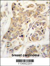 Formalin-fixed and paraffin-embedded human breast carcinoma tissue reacted with CDH8 antibody (N-term) (Cat. APR11571G), which was peroxidase-conjugated to the secondary antibody, followed by DAB staining. This data demonstrates the use of this antibody for immunohistochemistry; clinical relevance has not been evaluated. |