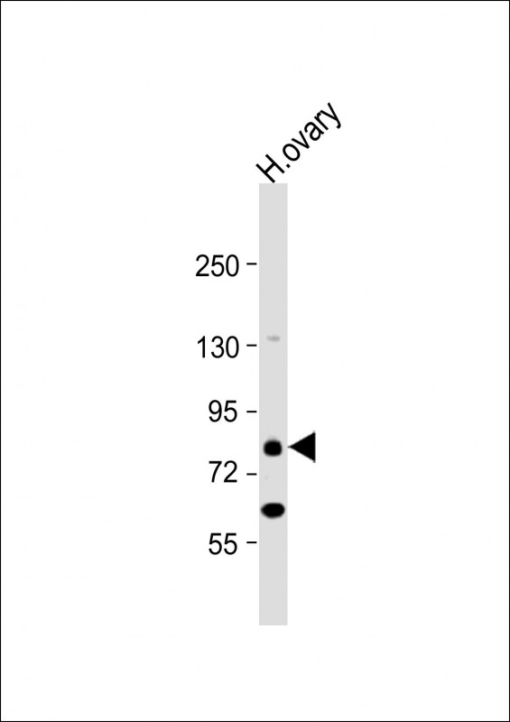 Anti-DDX4 Antibody (C-term) at 1:1000 dilution + human ovary lysate Lysates/proteins at 20 μg per lane. Secondary Goat Anti-Rabbit IgG, (H+L), Peroxidase conjugated at 1/10000 dilution. Predicted band size : 79 kDa Blocking/Dilution buffer: 5% NFDM/TBST.