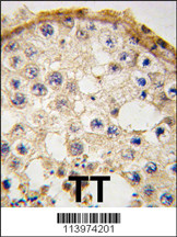 Formalin-fixed and paraffin-embedded human testis tissue reacted with DDX4 antibody (C-term) (Cat. APR15712G), which was peroxidase-conjugated to the secondary antibody, followed by DAB staining. This data demonstrates the use of this antibody for immunohistochemistry; clinical relevance has not been evaluated. |