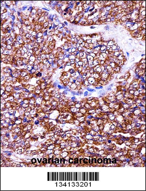 BAG2 Antibody (C-term) (APR07076G)immunohistochemistry analysis in formalin fixed and paraffin embedded human ovarian carcinoma followed by peroxidase conjugation of the secondary antibody and DAB staining.This data demonstrates the use of BAG2 Antibody (C-term) for immunohistochemistry. Clinical relevance has not been evaluated. |