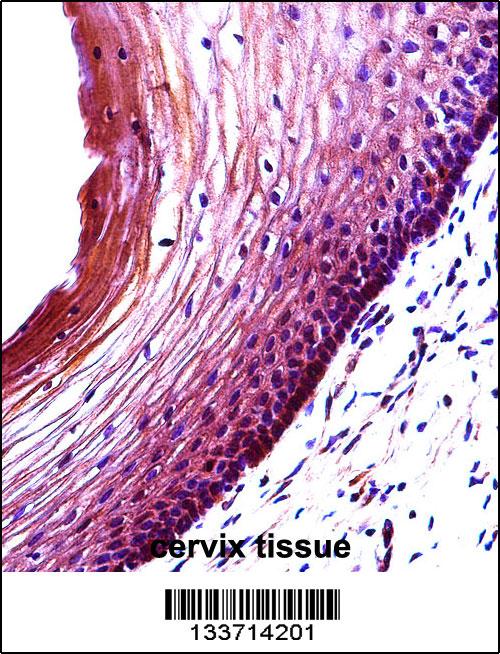 BBC3 Antibody (Center) (Cat. APG02215G)immunohistochemistry analysis in formalin fixed and paraffin embedded human cervix tissue followed by peroxidase conjugation of the secondary antibody and DAB staining.This data demonstrates the use of BBC3 Antibody (Center) for immunohistochemistry. Clinical relevance has not been evaluated. |