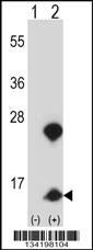 Western blot analysis of HMGN1 (arrow) using rabbit polyclonal HMGN1 Antibody (N-term) (Cat. APR12388G). 293 cell lysates (2 ug/lane) either nontransfected (Lane 1) or transiently transfected (Lane 2) with the HMGN1 gene.