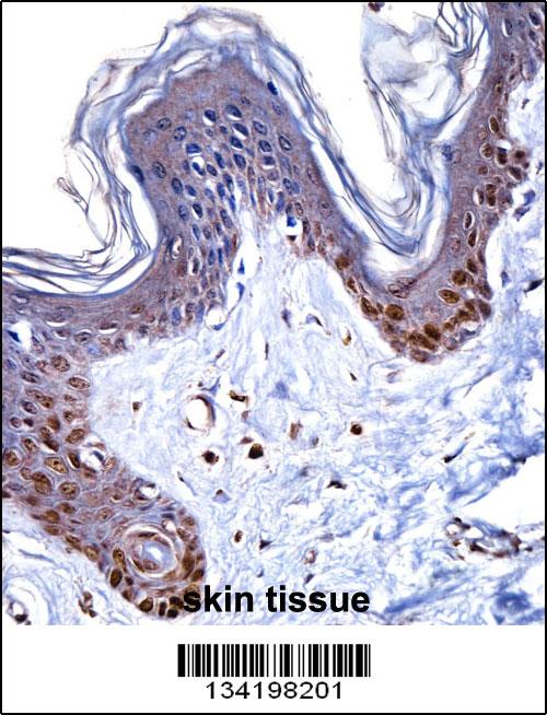 HMGN1 Antibody (N-term) (APR12388G)immunohistochemistry analysis in formalin fixed and paraffin embedded human skin tissue followed by peroxidase conjugation of the secondary antibody and DAB staining.This data demonstrates the use of HMGN1 Antibody (N-term) for immunohistochemistry. Clinical relevance has not been evaluated. |