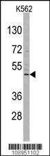 Western blot analysis of DRAGON (RGMB) Antibody (C-term) in K562 cell line lysates (35ug/lane). DRAGON (arrow) was detected using the purified Pab. |