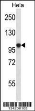 HCN1 Antibody (C-term) (Cat. APR12349G) western blot analysis in Hela cell line lysates (35ug/lane).This demonstrates the HCN1 antibody detected the HCN1 protein (arrow).