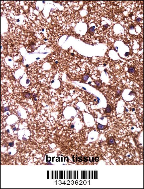 HCN1 Antibody (C-term) (APR12349G)immunohistochemistry analysis in formalin fixed and paraffin embedded human brain tissue followed by peroxidase conjugation of the secondary antibody and DAB staining.This data demonstrates the use of HCN1 Antibody (C-term) for immunohistochemistry. Clinical relevance has not been evaluated. |