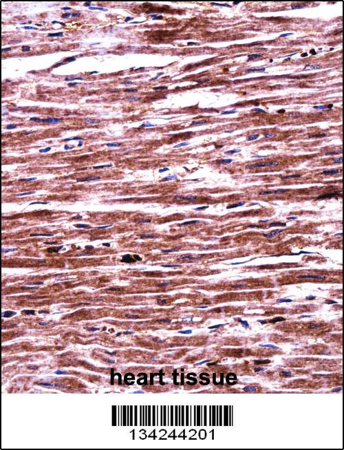 RNF19A Antibody (Center) (APR13132G)immunohistochemistry analysis in formalin fixed and paraffin embedded human heart tissue followed by peroxidase conjugation of the secondary antibody and DAB staining.This data demonstrates the use of RNF19A Antibody (Center) for immunohistochemistry. Clinical relevance has not been evaluated. |