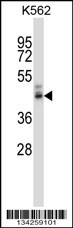 PPYR1 Antibody (N-term) (Cat. APR12957G) western blot analysis in K562 cell line lysates (35ug/lane).This demonstrates the PPYR1 antibody detected the PPYR1 protein (arrow). |