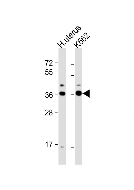 All lanes : Anti-OR52H1 Antibody (C-term) at 1:1000 dilution Lane 1: human uterus lysate Lane 2: K562 whole cell lysate Lysates/proteins at 20 μg per lane. Secondary Goat Anti-Rabbit IgG, (H+L), Peroxidase conjugated at 1/10000 dilution. Predicted band size : 36 kDa Blocking/Dilution buffer: 5% NFDM/TBST. |