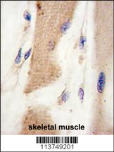 Formalin-fixed and paraffin-embedded human skeletal muscle tissue reacted with CDH15 antibody (C-term) (Cat. AMM06331G), which was peroxidase-conjugated to the secondary antibody, followed by DAB staining. This data demonstrates the use of this antibody for immunohistochemistry; clinical relevance has not been evaluated. |