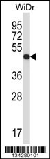 UQCRC2 Antibody (Center) (Cat. APR10669G) western blot analysis in WiDr cell line lysates (35ug/lane).This demonstrates the UQCRC2 antibody detected the UQCRC2 protein (arrow). |