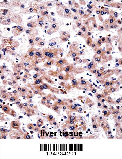 RCAN3 Antibody (C-term) (APR13083G)immunohistochemistry analysis in formalin fixed and paraffin embedded human liver tissue followed by peroxidase conjugation of the secondary antibody and DAB staining.This data demonstrates the use of RCAN3 Antibody (C-term) for immunohistochemistry. Clinical relevance has not been evaluated. |