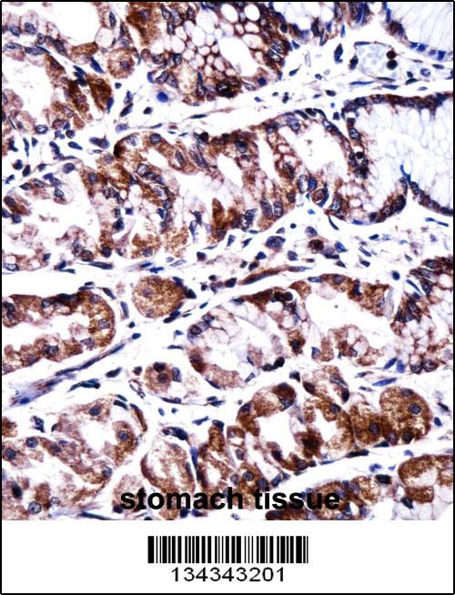 PPEF2 Antibody (Center) (APR12935G)immunohistochemistry analysis in formalin fixed and paraffin embedded human stomach tissue followed by peroxidase conjugation of the secondary antibody and DAB staining.This data demonstrates the use of PPEF2 Antibody (Center) for immunohistochemistry. Clinical relevance has not been evaluated. |