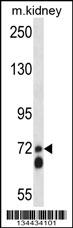 APLP2 Antibody (C-term) (Cat. APR11440G) western blot analysis in mouse kidney tissue lysates (35ug/lane).This demonstrates the APLP2 antibody detected the APLP2 protein (arrow).