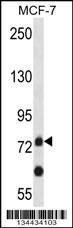 APLP2 Antibody (C-term) (Cat. APR11440G) western blot analysis in MCF-7 cell line lysates (35ug/lane).This demonstrates the APLP2 antibody detected the APLP2 protein (arrow).
