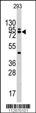 Western blot analysis of CDH12 Antibody (C-term) (Cat. APR15391G) in 293 cell line lysates (35ug/lane). CDH12(arrow) was detected using the purified Pab.