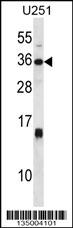 STC1 Antibody (C-term) (Cat. APR10288G) western blot analysis in U251 cell line lysates (35ug/lane).This demonstrates the STC1 antibody detected the STC1 protein (arrow). |