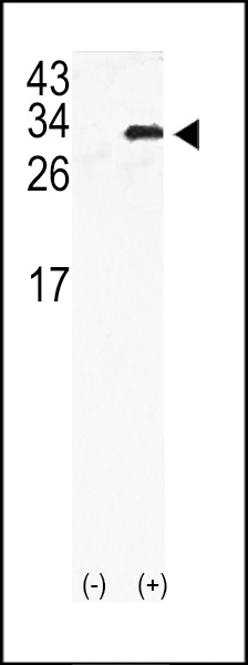 Western blot analysis of GJB6 (arrow) using rabbit polyclonal GJB6 Antibody (N-term) (Cat. APR12031G). 293 cell lysates (2 ug/lane) either nontransfected (Lane 1) or transiently transfected with the GJB6gene (Lane 2) (Origene Technologies).