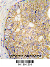 Formalin-fixed and paraffin-embedded human prostata carcinoma tissue reacted with GJB6 Antibody (N-term) (Cat. APR12031G), which was peroxidase-conjugated to the secondary antibody, followed by DAB staining. This data demonstrates the use of this antibody for immunohistochemistry; clinical relevance has not been evaluated. |