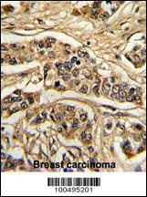 Formalin-fixed and paraffin-embedded human breast carcinoma reacted with NCS1 Antibody (Center), which was peroxidase-conjugated to the secondary antibody, followed by DAB staining. This data demonstrates the use of this antibody for immunohistochemistry; clinical relevance has not been evaluated.