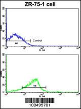 Flow cytometric analysis of ZR-75-1 cells using NCS1 Antibody (Center)(bottom histogram) compared to a negative control cell (top histogram). FITC-conjugated goat-anti-rabbit secondary antibodies were used for the analysis. |